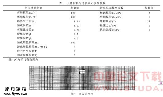 本文所采用的有限元模型与文[2]所采用的模型类似。分析所用软件为非线性液固两相体动力有限元软件DIANA-SWANDYNEII[3]。假定土体为饱和松砂,砂土的动力特性应用Pastor-ZienkiewiczIII广义塑性模型模拟[4],所采用的模型参数见表1[5]。饱和土与地下结构的接触面应用可模拟滑移、脱开以及闭合等非线性特性的薄层滑移单元模拟,其本构特性遵循Mohr-Coulomb破坏准则,模型参数如表1所示。假定地下结构的材料为线弹性,弹模为3.0×107kPa,Poisson比为0.2。