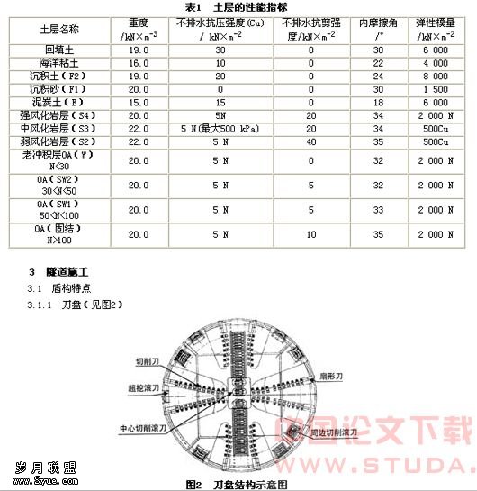 主要穿越的地层有老冲积层(OA)、中风化岩层(S2)和弱风化岩层(S3),具体的性能指标见表1。
