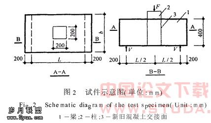 为了研究新旧砼交接面的承载力,先后进行了12组共25个试件的试验[2].试件设计和新旧砼交接面处理模拟实际工程情况,先浇制的短柱代表原结构,后浇制的包柱梁代表托换结构,梁柱之交接面即新旧砼交接面,如图2所示.