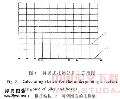 托换桩采用钻孔灌注桩、挖孔灌注桩或钢管灌注桩等桩型.托换梁采用钢筋混凝土梁,为减少挠度变形在托换梁内实施预应力张拉,托换梁通过新旧砼交接面与被托换建筑物的结构相连,新旧交接面需承受并传递全部的托换荷载.
