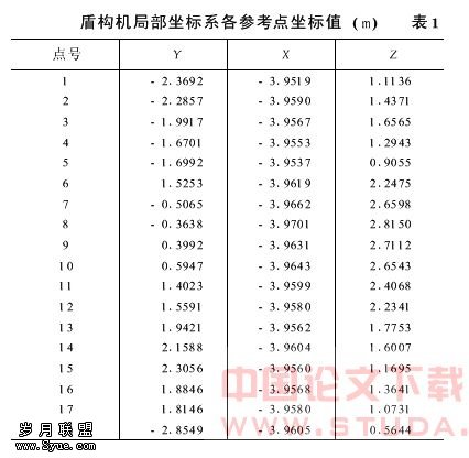 我们采用棱镜法来对盾构机的姿态进行检查。在盾构机内有18个参考点(M8螺母),这些点在盾构机构建之前就已经定好位了,它们相对于盾构机的轴线有一定的参数关系(见表1),即它们与盾构机的轴线构成局部坐标系(见图2)。在进行测量时,只要将特制的适配螺栓旋到M8螺母内,再装上棱镜。现在这些参考点的测量可以达到毫米的精度。已知的坐标和测得的坐标经过三维转换,与设计坐标比较,就可以计算出盾构机的姿态和位置参数等。