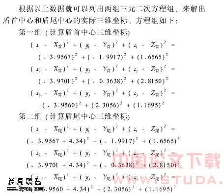 三个方程三个未知量,采用专业软件解算方程组。我们测出某一里程盾构机上三个参数点(3,8,15)的实际三维坐标分别为: