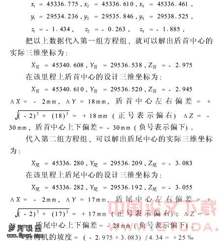 从以上数据可以得知,在与对应里程上盾首中心和盾尾中心设计的三维坐标比较后,就可以得出盾构机轴线与设计轴线的左右偏差值和上下偏差值,以及盾构机的坡度,这就是盾构机的姿态。
