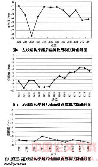 图5、图6是左、右线隧道盾构穿越后建筑物累积沉降曲线图;图7、图8为左、右线隧道盾构穿越后地面纵向累积沉降曲线图。