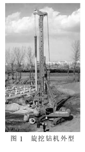 旋挖钻机( 如图 1) 因具有施工速度快、成孔质量好、环境污染小、操作灵活方便、安全性能高及适用性强等优势, 已成为钻孔灌注桩施工的主要成孔设备, 不少重点工程的业主为确保工程进度和质量, 均将其作为指定施工设备, 从而替代了传统的冲击和回旋钻机成孔设备。目前我国工程界的大多数旋挖钻机均为德国和意大利的产品, 并已占据主导地位。