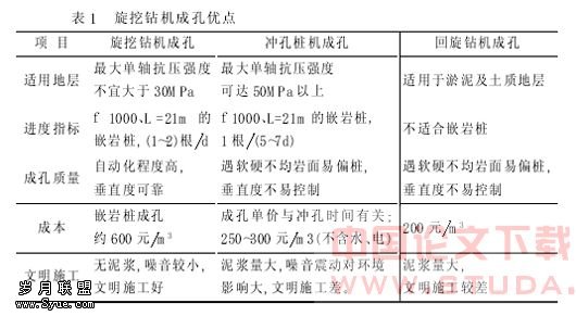 该地铁车站采用旋挖钻的施工情况, 与一般冲孔桩机成孔、回旋钻机成孔相比, 其优点见表 1。