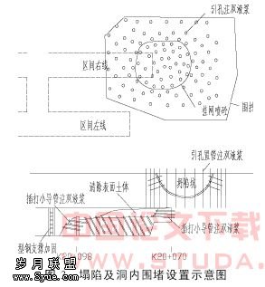 ⑶隧道洞内逐排小导管注浆至拱顶掌子面后,将K20+070~075段拱顶空洞处回填,并纵向打入6.0m长、间距0.5m的双层密排小导管,梅花型布置。单排51根,注入水泥-水玻璃双液浆,技术要求与上相同,以固结K20+070段掌子面涌泥部位(即地面坍陷坑下方),从底部保证土体的稳定,防止再次坍陷涌泥,造成更大的损失。