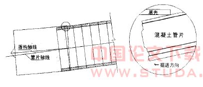 在盾构掘进过程中已拼装的管片中心线与盾构机本身的中心线重合为理想状态但在实际施工中两条轴线存在偏差千斤顶的中心没有作用在管片环的中心上,造成管片偏心受压(见图4)。