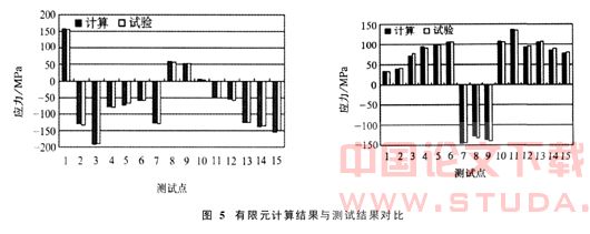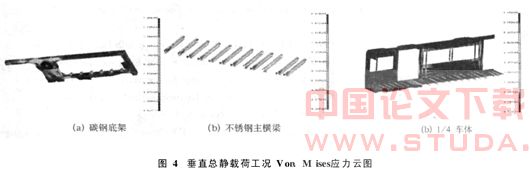 依据[7]进行加载计算,垂直总静载荷工况作用下车体和部件的Von.Mises应力云图如图4所示.该车FEA计算结果与强度试验测试结果[8]的对比如图5所示,由图5可以看出两者基本一致,因此,该计算模型质量很高.