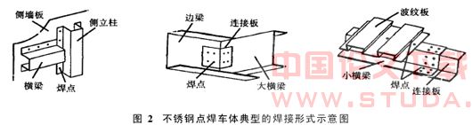 城市轻轨动车组不锈钢点焊车体是典型的点传力结构,全部采用高强度车辆专用的冷弯或轧压工艺制造的不锈钢型材.除车顶、地板的波纹板之间的连接采用缝焊,其余板与梁、柱及部件与部件之间的连接均采用接触点焊.由于板薄,板与板、板与梁(柱)和柱与柱之间只能采用搭接接头,除2层、3层搭接外,最多还有5层板搭接.该不锈钢车体大约有4万个焊点,该车典型的焊接示意图如图2所示.