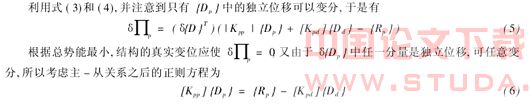 主-从关系(位移耦合),指的是当一个结点被定义为另一个结点的从结点后,该从结点就失去了位移的独立性,它的位移只能且必须从属于主结点.主结点上的位移处理为独立位移,从结点上的位移为相关位移.