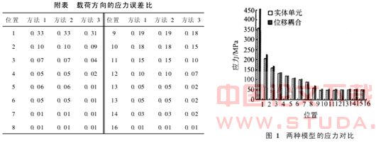 以实体元计算结果为标准,t1薄板上载荷方向的应力误差比列入附表.表中方法1为采用梁单元;方法2为采用刚性单元;方法3为采用位移耦合.表中位置点1至点8依次为t1薄板上过原点与载荷方向一致的坐标轴上等距离的点;位置点9至点16依次为t1薄板上过原点与载荷方向垂直的坐标轴上等距离的点.表中应力误差比的定义为(σ-σ0)/σ0,其中σ0为实体元计算结果.由附表可以看出:位移主—从约束建模方法的误差较小,刚性单元和梁元的较大.