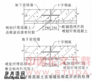 地下墙缝是渗漏的多发区域, 即使在经过多次堵漏之后, 如果结构发生变形, 墙缝发生渗漏的概率仍然很大; 并且多起工程实践表明, 堵漏所需的时间并不能得到保障, 所以喷射纤维混凝土在墙缝处要采取特殊处理。工程实施中, 在地下墙缝 50 cm 范围内采用配有 Φ8@200( 双向) 钢筋网片的喷射纤维混凝土,作为地下墙缝的补强措施, 见图 4 所示。