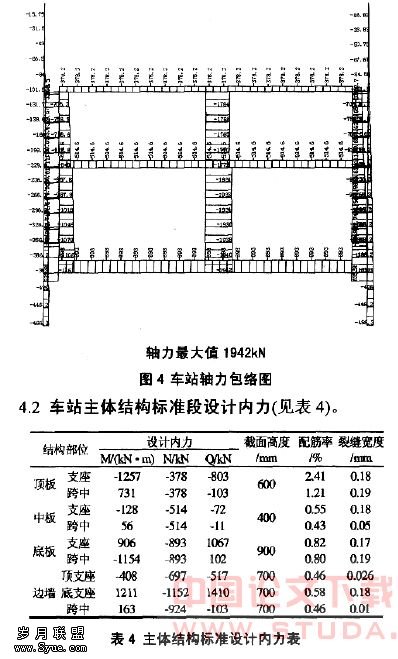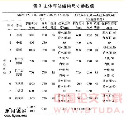 地铁车站的主要施工方法有有明挖法、盖挖法以及暗挖法施工。目前国内外最主要的施工方法采用明挖法施工,本车站主体及站后折返线均采用明挖法施工。主要结构尺寸的拟定是在满足建筑限界和建筑设计的基础上、考虑施工误差,测量误差、结构变形、沉陷等因素,根据地质和水文资料,车站埋深,结构类型,施工方法等条件经过计算确定(见表 3)。车站为沿二号线地下二层二跨框架明挖结构,主体结构均为钢筋砼框架型式,由边墙、立柱、梁板组成结构体系、顶板、中板承受竖向荷载,通过纵向主梁下的柱子和边墙将荷载传递到底梁和底板。