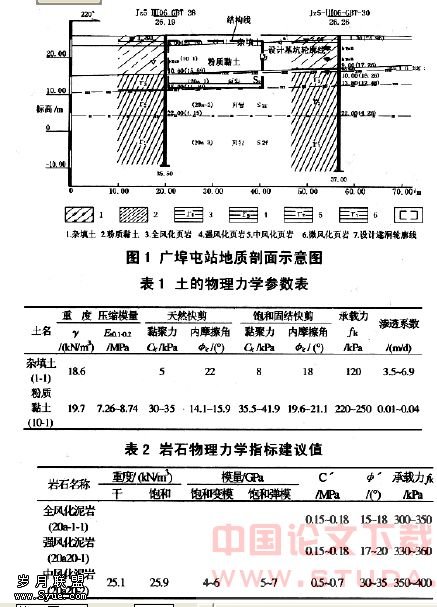 车站基坑拟定设计长度为 460m ,宽 19.9m ,基坑深 15m  ̄18m 。基坑壁地层岩性从上至下为:杂填土(1-1),厚 1.3m  ̄3.6m ;粉质黏土(10-1),层厚 5.9m ̄8.0m ,埋深 1.3m  ̄3.6m ;全风化泥岩(20a-1-1),厚 0m  ̄3.6m ,埋深 8.6m ,呈透镜状分布于 Jz5-Ⅲ06-G BT-09孔一带;强风化泥岩(20a-1),厚 4.0 m  ̄4.8m ,埋深9.0m  ̄11.0m ;中风化泥岩(20a-2),层厚 7.0m  ̄10.5m,埋深 14.0m ̄15.0m。本站位于龙阳湖——王家店倒转背斜南翼,地层倒转,产状为 15°~75°;其他地质剖面系统见图 1,各土层的物理参数和岩土物理力学指标建议值见表 1 和表 2。