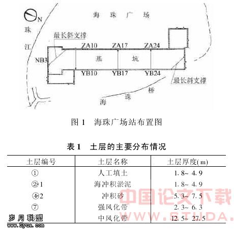 某市地铁二号线的海珠广场站基坑由三部分组成:车站主体部分为147m×21.1m和27.5m(盾构井)的矩形基坑,开挖深度分别为24.5m和26m(盾构井)。东南端水处理用房部分为26.5m×15.8m的矩形基坑,开挖深度为12.8m。车站西北端风道及小站厅部分为23m×17.5m的矩形基坑,开挖深度为16m,三部分连成一片,采用明挖法整体施工(见图1)。海珠广场站基坑采用地下连续墙加钢支撑的围护结构,连续墙是5m一个槽段,墙厚800mm,设五道Φ609的钢管钢撑。土层主要的分布情况如表1所示,基坑南端距珠江边平均约40m左右,地下水丰富,与珠江水位密切相关。