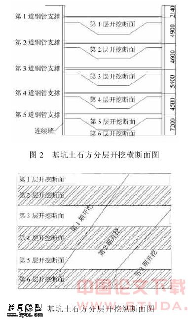 从横向看,基坑土石方的分层开挖施工可分为六个步骤(如图2):第1步,挖至约6m深(这里指的是最深处,下同);第2步,架第1道支撑,然后挖至10.5m;第3步,架第2道支撑,挖至15m;第4步,架第3道支撑,挖至约21m;第5步,架第4道支撑,挖至25.5m;第6步,架第5道支撑,挖至最终开挖面。在实际施工中,开挖面与预定开挖面有出入,进入岩层以后,有普遍超挖现象。