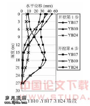 图5分别是YB10、YB17、YB24墙段在第1开挖步和第6开挖步的实测水平位移。