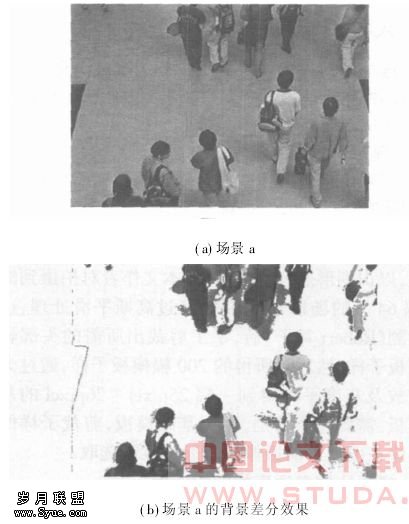 利用Kalman自适应背景模型差分后得到的图象如图1所示.其中,背景用白色表示,前景区域用被处理图像的原灰度表示.