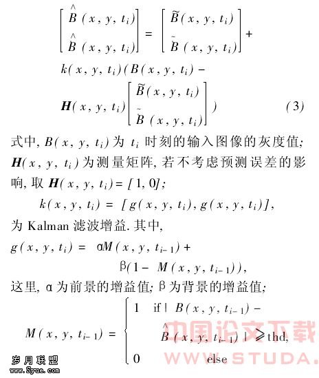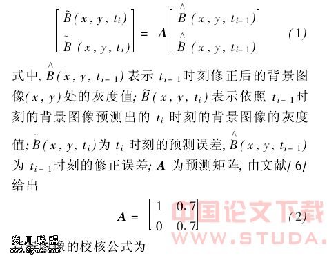 Kalman自适应背景模型的提取分为两个步骤:背景预测和背景校核.背景图像的预测公式为