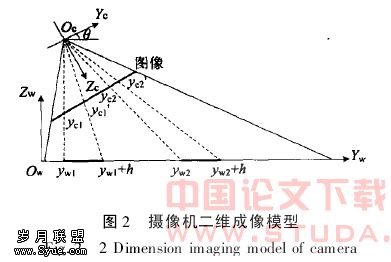 根据计算机立体视觉测量技术中经常采用的针孔模型[7],得到图2所示的二维成像模型.图2中,(Yc,Zc)为摄像机坐标系,原点定义在摄像机的光心,Zc轴为摄像机的光轴;(Yw,Zw)为世界坐标系,Zw轴垂直于水平面,将原点定义在Yc轴与Yw轴的交点处;θ为摄像机与地面的拍摄角度,拍摄到的图像垂直于Zc轴.