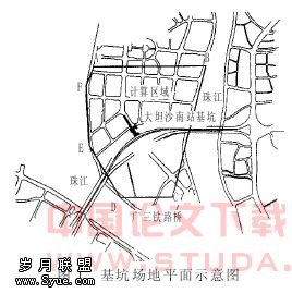 该场地位于双桥路, 部分地段为农田, 地形平坦, 地面高程 5.61m ̄7.70m, 为珠江干流冲积形成的江心沙洲, 东西两侧均为珠江流域。基坑南侧为广三铁路及公路, 西面距基坑边 4m 处为木桩基础的某娱乐城, 附近为天然浅基础或木桩基础的民居。附近无高层建筑。
