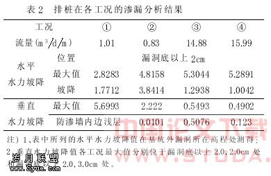 工况③、④的漏洞位于基坑面以下一定深度, 其发生流土破坏的控制因素是垂直水力坡降。从表 2可知, 两种工况下排桩内侧基坑底面处的垂直水力坡降均小于 0.99(根据太沙基公式)且安全系数均大于 1.5, 表层不发生垂直渗透破坏, 这两种工况就不存在流土破坏的问题, 但渗流量就比较大。