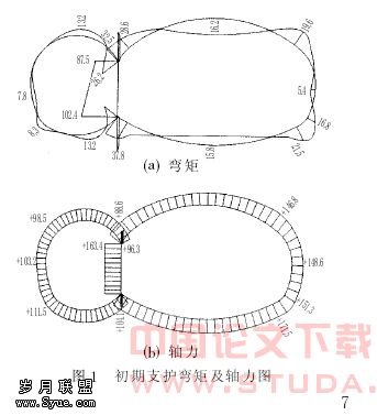 采用 SAP8450 程序进行计算, 可得出大跨度不对称双联拱隧道初期支护弯矩及轴力如图 1 所示, 据此进行结构设计。再通过计算得出挖土支护各工序( 如图 2), 分别为: ①中导洞上导挖支; ②中导洞下导挖支; ③双线断面右半侧上导挖支; ④双线断面右半侧下导挖支; ⑤中墙衬砌; ⑥单线断面上导挖支; ⑦单线断面下导挖支; ⑧单线断面仰拱衬砌及回填; ⑨单线断面拱墙衬砌; ⑩双线断面左半侧上导挖支; ,⑾双线断面左半侧下导挖支;.⑿双线断面仰拱衬砌及回填; ⒀双线断面拱墙衬砌。各工序开挖的最小错开距离分别为: ①与②、③与④、⑥与⑦、⑩与⑾为3m,其余均为15m。