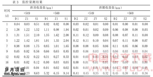 现场采用 WRM- 3 收敛仪进行拱顶位移和内净空位移进行量测, 挖支完成后即布设量测点, 每个测量断面共设拱顶沉降量测点 3 个(分别位于中导洞和单、双线断面的拱顶), 收敛量测点 4 个(分别位于单、双线断面最大跨度处和中导洞起拱线的左右侧)。双联拱段按 10m 左右设 1 个断面, 共设 2 个。具体量测结果见表 1, 据此进行数据处理,断面开挖后围岩一般在 12d 内趋于稳定。所有临时支撑体系在半月内不应拆除, 以防拱顶变形过大而造成破坏。