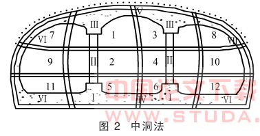 中洞法先开挖中间部分(中洞),在中洞内施作梁柱结构,然后再开挖两侧部分(侧洞),并逐渐将侧洞顶部荷载通过中洞初期支护转移到梁、柱结构上。由于中洞的跨度较大,施工中一般采用CD法、CRD法等进行施作。具体施工顺序见图2。