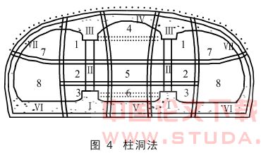 柱洞法施工引起的地面沉降量较小,安全度大,但中洞开挖时受力转换复杂。地铁五号线崇文门站下穿既有线和东四站下穿东四菜市场浅埋暗挖段采用了柱洞法施工。
