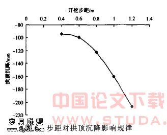 图 6 为隧道不同开挖步距对最终拱顶沉降的影响规律曲线。随着开挖步距的增加, 拱顶沉降也在增加。尤其是当开挖步距超过 0.6 m 后, 拱顶沉降急剧增加。对该曲线采用非线性回归可得:
