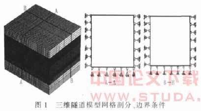 地铁隧道为马蹄形, 净宽 5.1 m, 净高 5.4 m, 初支为格栅钢架和 C20 喷射混凝土, 厚 0.3 m, 钢架间距为 0.8 m。二衬为 C30 钢筋混凝土, 厚 0.3 m。取水平方向为 X, 垂直方向为 Y, 隧道轴线方向为 Z。考虑隧道开挖的影响范围及开挖隧道的对称性, 计算范围为开挖隧道的一半作为计算对象, 取 X×Y×Z=25 m×20 m×30 m。在上述区域内划分三维有限差分网格。整个模型划分为 49 830 节点, 44250 个单元。模型的三维尺寸、网格划分和边界条件如图 1 所示。