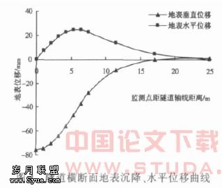 图 4 为隧道围岩变形稳定后的横断面地表位移曲线。由图中可以看出, 隧道开挖时的地表形成一个沉降槽, 沉降槽的中心位于隧道的轴线位置。地表最大水平位移出现在距离隧道轴线 1 倍洞径的位置, 为24.67 mm。