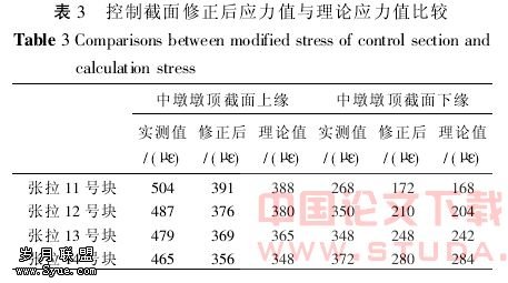 由于钢弦式应变计所测为应变,其中有以上所述诸多因素的影响。本桥施工监控部分实测应变与理论应变值列于表3。以中墩墩顶截面为例,如张拉13号块上缘实测应变为479,理论值为365, 误差高达31%,实测应变偏大主要是收缩徐变、温度变化等因素引起,这部分应变不是由外荷载引起的(本桥施工是采用悬臂浇筑),故需采用修正方法剔除这部分虚假应变。