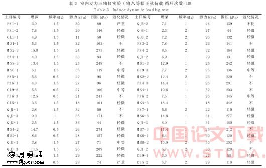 MTS 动力三轴仪, 能够施加各种循环荷载, 等幅或非等幅荷载, 主要模拟低频运动。在测定砂土液化时, 围压可以变化, 也可以模拟土样在变幅荷载作用下的液化情形, 为此我们在二号线东部进行大量取样, 进行系列室内试验研究。土样的制备主要有砂雨法、湿振法和湿捣法等, 提高饱和度的方法主要有通入二氧化碳或氮气, 或进行反压饱和等。实验条件与结果见表 2、表 3。