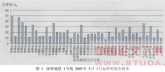 图1是2005年5月1日节假日空调全部投入运行和车站照明全部开启情况下深圳地铁1号线各站配电变压器在正常运行时段变压器负载率情况。均低于30%。全线平均负载率为17.8%。上述数据从图1中可以看出,在正常运行时段(6∶30~23∶30),80%以上的配电变压器的负载率低于30%以下,只有不到20%的变压器的负载率在30%~50%之间。经统计计算得出,在地铁正常运行时段全线配电变压器的平均负载率为20.77%,全天的平均负载率为18.58%。此外,根据各车站半年的负荷统计计算得知,除一个车站的平均负载率略大于30%外,其他车站远低于我国目前干式变压器50%~60%效益最佳负载率的状况,更低于电力工程设计规范配电变压器负载率一般取70%~85%的要求。