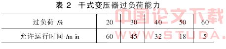 电力变压器无论是油浸式变压器还是干式变压器,都具有一定的过负荷能力(见表2)。在电力系统的运行中遇到特殊情况,变压器短时间过负荷运行是常见的事。但在地铁的设计过程中,对此情况一般都不敢考虑,认为变压器一旦接近满载甚至短时超载,变压器很快就会烧坏,这也是地铁负荷计算宁大勿小的一个因素。