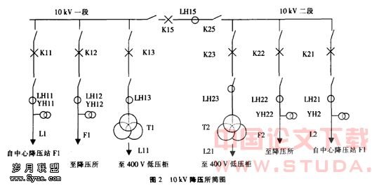 由于牵引供电系统与降压供电系统分别组成相对独立的环网供电系统,一个系统故障不影响另一个系统的运行。每一降压所均为两路进线,10 kV进线电源来自于中心降压站或上一个降压所,10 kV出线通过环网电缆连接于下一个降压所进线,一二段母线间加设联络断路器,当某一进线失压时,自动投人,保证两段母线供电。
