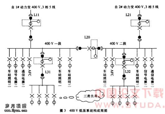(3)负荷分类多:400 V用电负荷主要为信号电源、通信电源、自动售票(AFC)一类负荷,车站照明、电梯、通风电源二类负荷以及冷水机组,采暖等三类负荷低压负荷构成(400 V降压系统见图3).