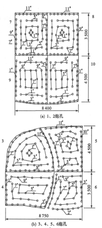 针对不同的开挖支护施工方法采用不同的爆破方案,本工程暗挖隧道的施工方法是中洞法结合CD法、CRD法,因岩层处于中硬层,故施工中上半断面采用光面爆破开挖,下半断面采用预裂爆破开挖,掏槽眼眼距200mm,周边眼眼距500mm,掘进辅助眼眼距700—750mm,1#—1#为起爆顺序。按照开挖顺序,炮孔布置如图3所示。