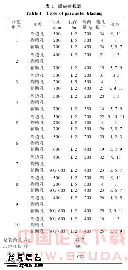 本工程在参数选取过程中综合运用工程类比和理论计算2种方法,结合广州地铁二号线工程的成功爆破经验,按照类似围岩、类似隧道的成功爆破设计方案选择参数,各部的爆破参数如表1所示。