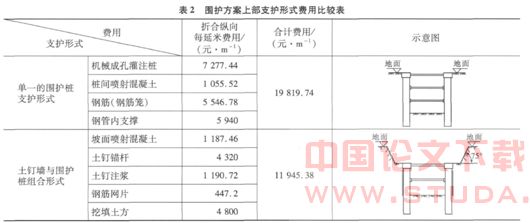 以本工程为例,仅对围护方案上部支护形式变化费用进行分析,如表2所示。