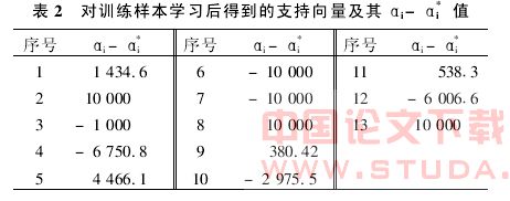 首先进行核函数的选取,通过对多项式核函数、径向基函数(RBF)核函数、Sigmoid核函数的比较分析,发现σ=300的径向基函数核函数比较适合地铁车站深基坑围护结构最大变形值的预测问题。然后通过不同的参数的试验,发现C=10000,经过学习训练,得到13个支持向量,各个支持向量的αi-α*i及其对应的样本序号见表2,相应的w0和b分别为459.6995、86.584627。