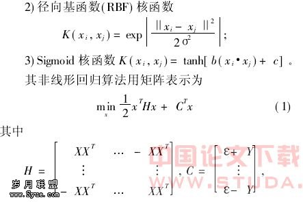 支持向量机理论只考虑高维特征空间的点积运算K(xi,xj)=Φ(xi)·Φ(xj),而不直接使用函数Φ,从而巧妙地解决了因Φ未知而w无法显式表达的问题,称K(xi,xj)为核函数。已经证明,只要满足Mercer条件的对称函数即可作为核函数,常用的核函数有: