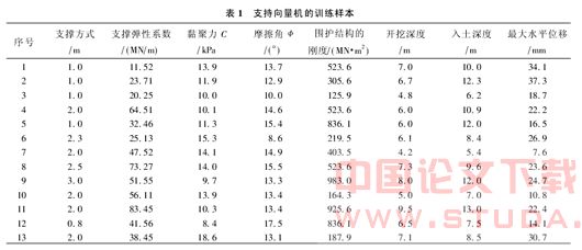 本文利用相关及已知的南京基坑数据资料[6]建立支持向量机预测模型的训练样本,该样本如表1所示。