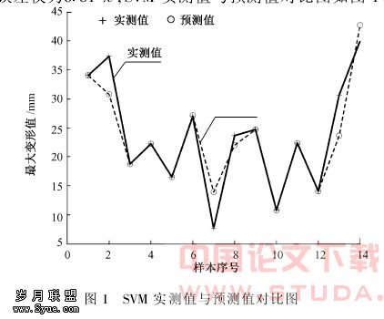 用得到的w0和b分别对训练和检验数据预测,得到南京地铁逸仙桥站端头井地下连续墙最大变形值42.725mm,而在施工过程中实测值为40mm,其相对误差仅为6.81%;SVM实测值与预测值对比图如图1。为了与SVM方法进行对比,用BP神经对表1数据进行训练,得出最大变形值预测结果为31.267mm,其相对误差约为21.83%。