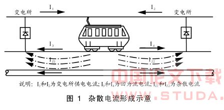 直流供电牵引系统中,列车所需电流由牵引变电所提供,通过接触网(架空线或接触轨)向列车送电,然后经走行轨回流至牵引变电所。由于钢轨的绝缘材料埋在地下,不可能做到完全绝缘,并且随着时间的推移,其绝缘水平将会逐渐下降,不可避免地将造成部分电流不从钢轨回流,而是通过沿线的道床钢筋、隧道、高架桥或建筑物的结构钢筋或土壤回流到牵引变电所,这一部分电流就是杂散电流,杂散电流的形成如图1所示。