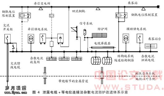 4 泄漏电缆+等电位连接法杂散电流防护改进体系泄漏电缆+等电位连接法防护体系完全克服了排流法的缺点,其系统组成示意图如图4。
