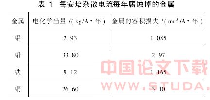 据[1],每安培杂散电流每年腐蚀掉的金属见表1。